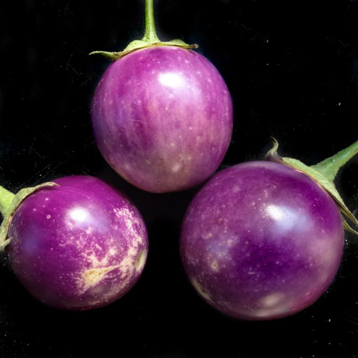 Eine ebenso wohlschmeckende wie auffallend schöne Aubergine. Aus violetten Blüten gehen kleine, kugelige fliederfarbene Früchte hervor, die in der Abreife zunehmend weiß werden. Ertragreich, auch im Freiland. Voranzucht: III; Pflanzung: Mitte Mai auf 50X40cm