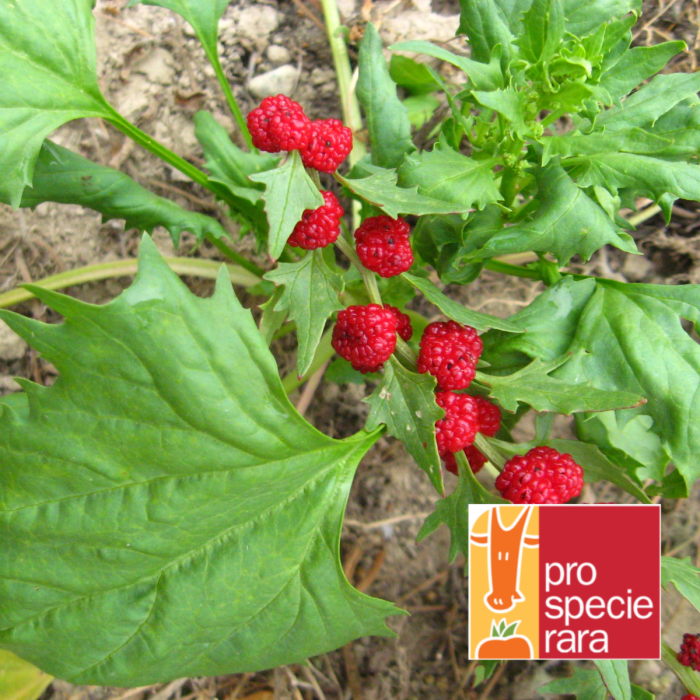 Einjährige, alte Spinatsorte mit kleinen Blättern und schönen, roten erdbeerähnlichen Früchten. Sehr dekorativ auf Salaten. Pro Specie Rara-Sorte.