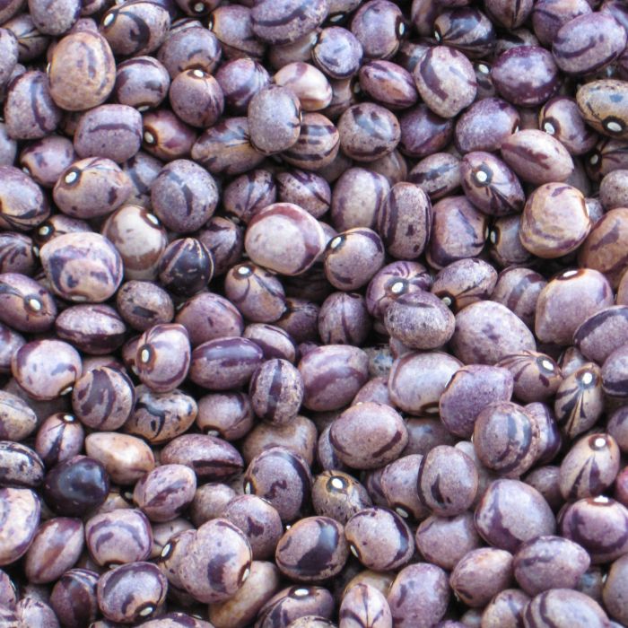 Ovalrunde Trockenbohne mit sehr hübscher bläulich-schwarzer Maserung der Kerne, ähnlich Forellen. Mittelspäte Sorte.
