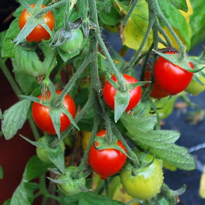 Cocktail-Buschtomate speziell für Kübel und Balkon mit zahlreichen, roten Tomätchen an überhängenden Rispen.