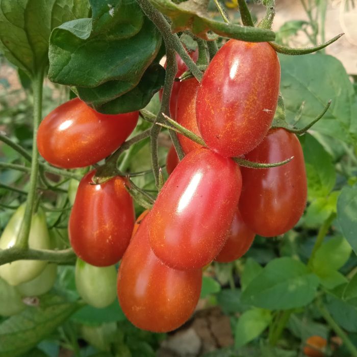 Kräftig wachsende Cocktailtomate mit dattelförmigen, dickfleischigen, sehr wohlschmeckenden, roten Früchten mit wenig Samen. Freilandgeeignet.
