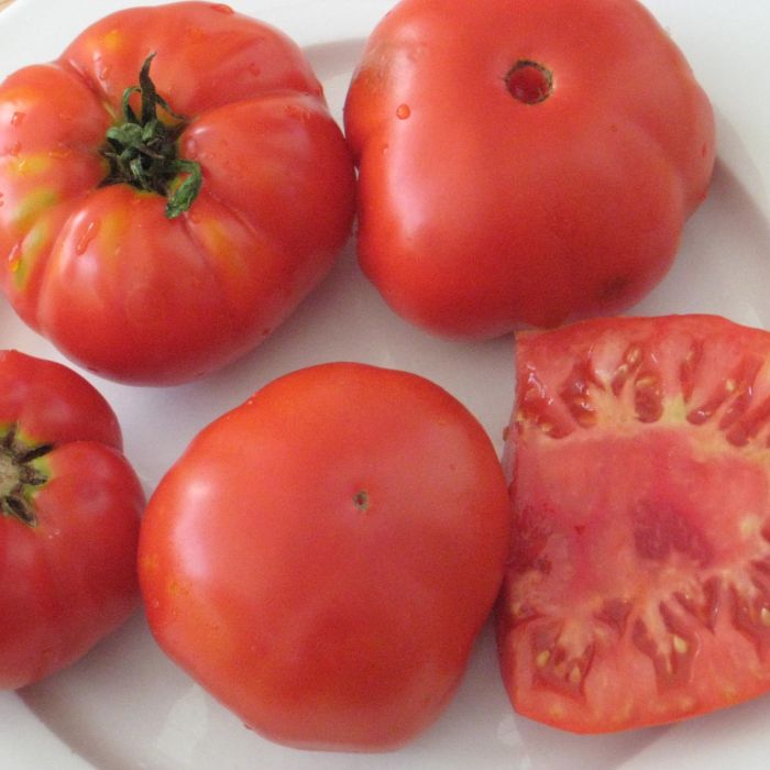 Gute, rote, saftige, französische Fleischtomate; Früchte eher flachrund mit ganz leichter Rippung.
