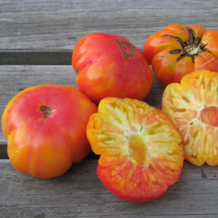 Wird auch als Ananastomate bezeichnet. Große flach-rundliche Früchte mit 8-12cm Durchmesser; gelb-rote Maserung in der Haut und im Fleisch; wenig Samen.