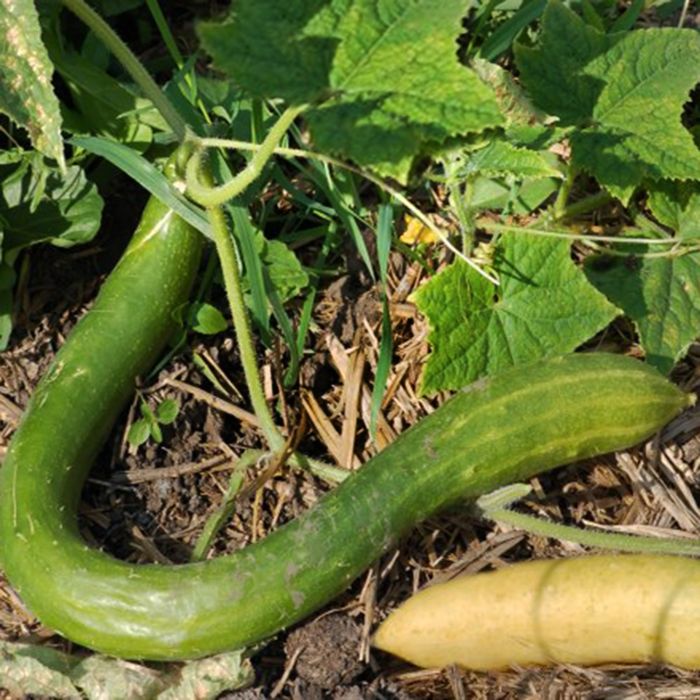Wieder neu verfügbar. Richtige Schlangengurke für das Freiland mit langen (bis 70 cm), schmalen und knackigen Früchten. Für gerade Früchte hochbinden.