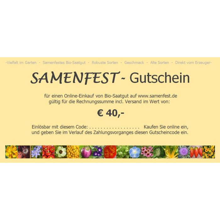 Schenken Sie Vielfalt für den Garten. Dieser Gutschein ist für den Kauf aus unserem gesamten Saatgut-Sortiment einlösbar (Warenwert plus Versandkosten).