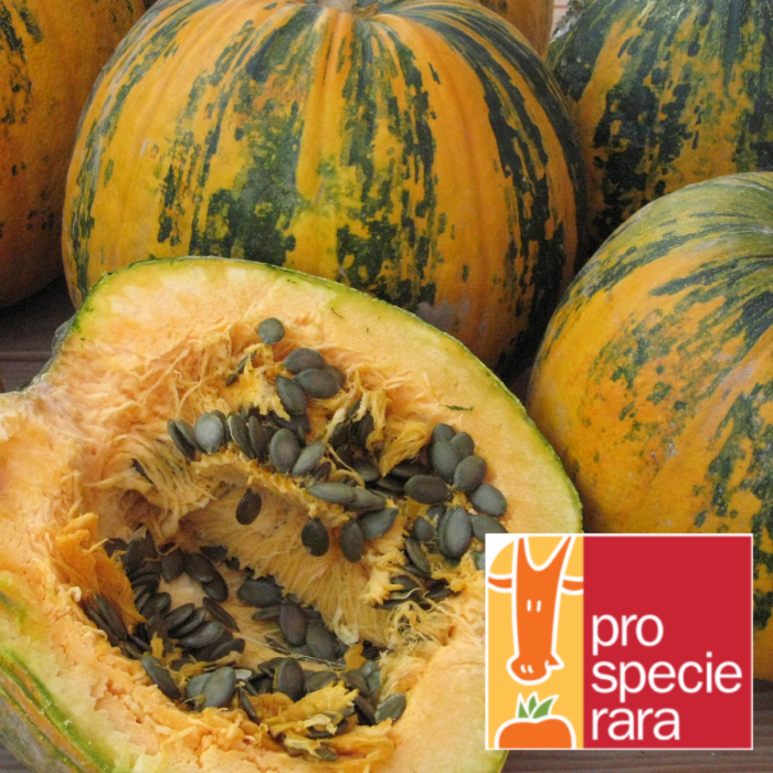 Pro Specie Rara-Sorte. Leckere, grüne Kürbiskerne (ohne Schale) selber ernten. Der Geschmack der Kerne ist einmalig.