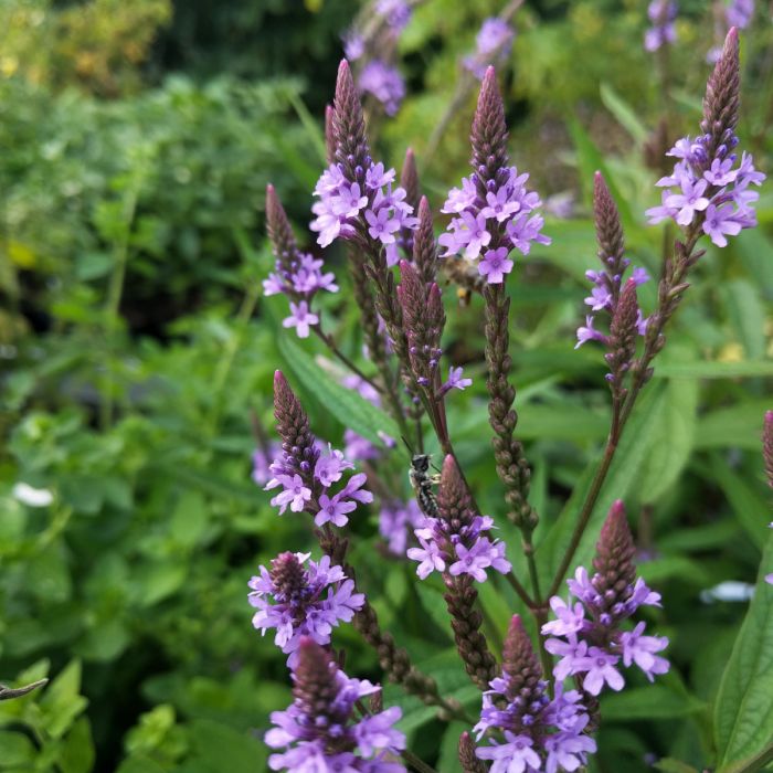 Mehrjährige, ausbreitungsfreudige Staude mit lanzettlichen Blättern und kandelaberförmigen, blauen Blütenrispen. Auch amerikanisches Eisenkraut genannt. Standort sonnig, trocken bis frisch, keine besonderen Bodenansprüche. Nur Staunässe ist zu vermeiden. Lässt man die Samenstände über den Winter stehen, sät es sich gerne selbst aus. Die Samen brauchen einen Kältereiz zum keimen. Auch gut für Sträuße geeignet. Samen als Winterfutter für Vögel stehenlassen. Sehr winterhart, angeblich bis -37°C. Aussaat März/Sept, Abstand 30cm.