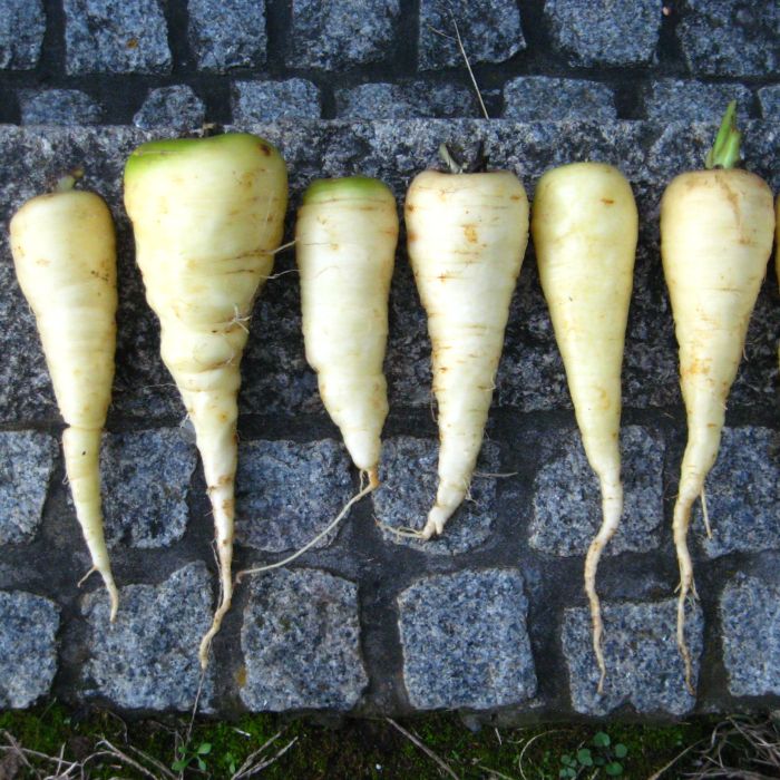 Alte, weiße Möhrensorte aus Küttigen in der Schweiz. Konische Wurzel mit intensivem Ruebli-Geschmack.