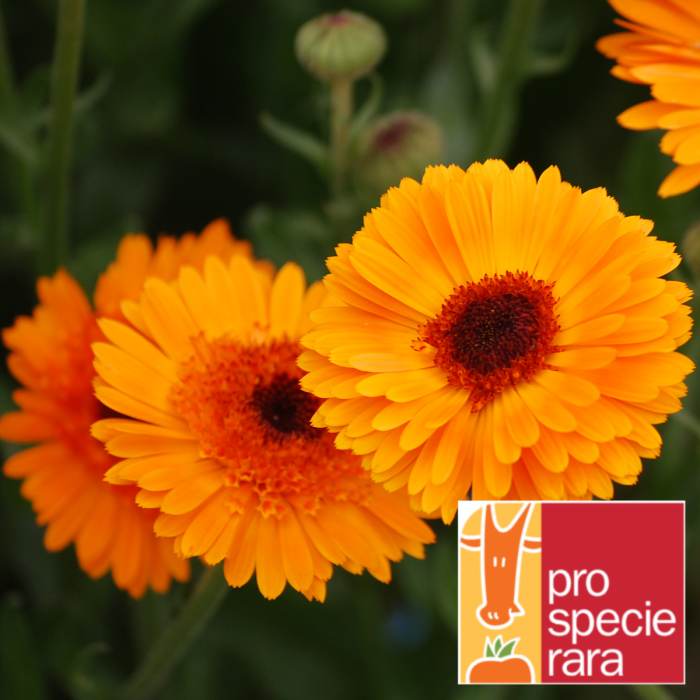 Dichtgefüllte, orange Sorte mit dunkler Mitte. Pro Specie Rara-Sorte. Ideal für Sträuße.