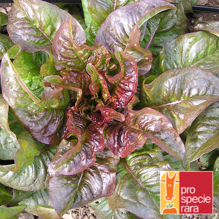 Französ.: Oreilles du diable. Pro Specie Rara-Sorte. Längliche, schmale, spitz zulaufende granatrote Blätter. Offener Wuchs, ähnlich Eichblattsalat.