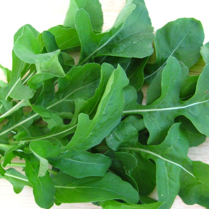 Rucola mit breiteren Blättern und milderem Rauke-Aroma; der Geschmack geht eher in Richtung Asia-Salat/Radieschen. Verwendung in Salaten, auf Pizza oder Nudelgerichten; auch als Topfkultur möglich.