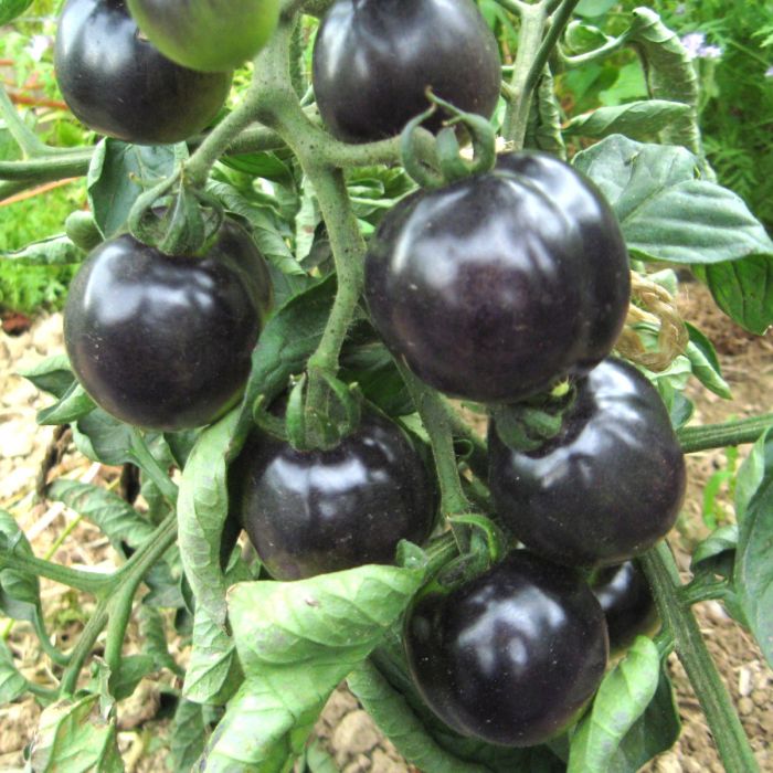 Schwarze Salattomate, die sich in der Reife leicht rötet; feste Früchte mit wenig Geschmack. Reife eher spät.
