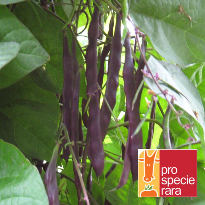 Lange, runde, dickfleischige, dunkelblaue Hülsen, die beim Kochen grün werden; sehr ertragreiche Sorte. Pro Specie Rara-Sorte. Die Pflanze hat bereits dunkelgrün-bläuliche Blätter. Aussaat Anfang Mai bis Ende Juni. 6-10 Bohnen pro Stange. Stangenabstand ca. 80x100cm.