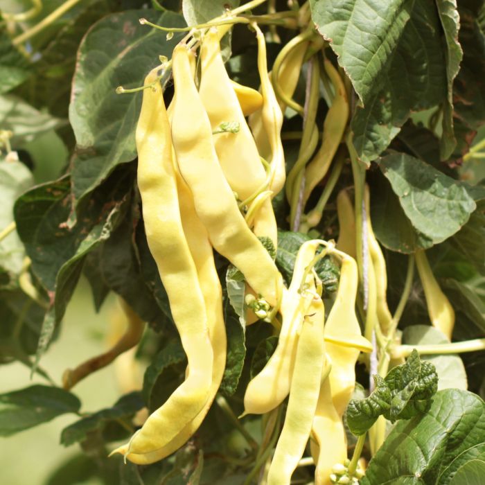 Frühe und reichtragende Schwertwachsbohne mit langen, flachen Hülsen von hellgelber Farbe mit weißen Bohnensamen. Säen ins Freiland ab Ende IV bis VII. Ca. 5 Korn pro Stange.