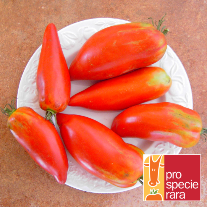 Lange, spitze Marktomate mit ausgesprochen feinem Geschmack, wenig Samen und wenig Saft. Durchmesser 4-6cm, Länge 8-15cm. Pro Specie Rara-Sorte.