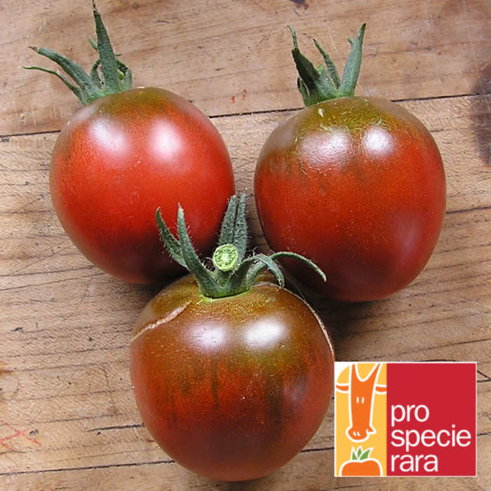 Dunkelbraunrote, geflammte, mittelgroße, runde Früchte. Pro Specie Rara-Sorte. Platzfest, aromatisch.