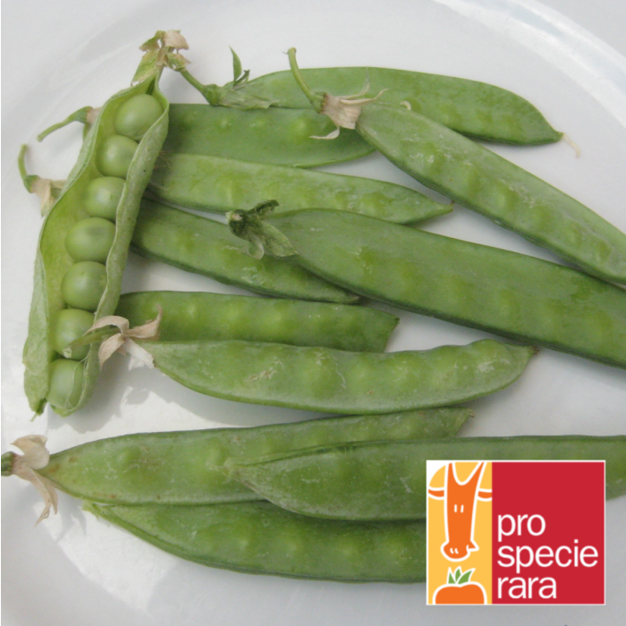 Ab Ernte 2025 wieder lieferbar. Stark wachsende mittelfrühe Zuckererbse mit großen Hülsen. Pro Specie Rara-Sorte.